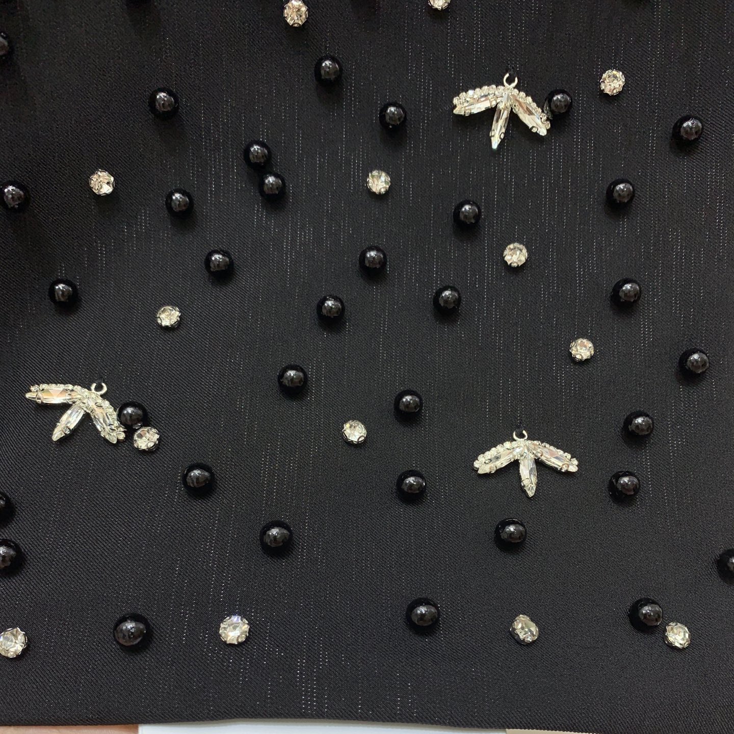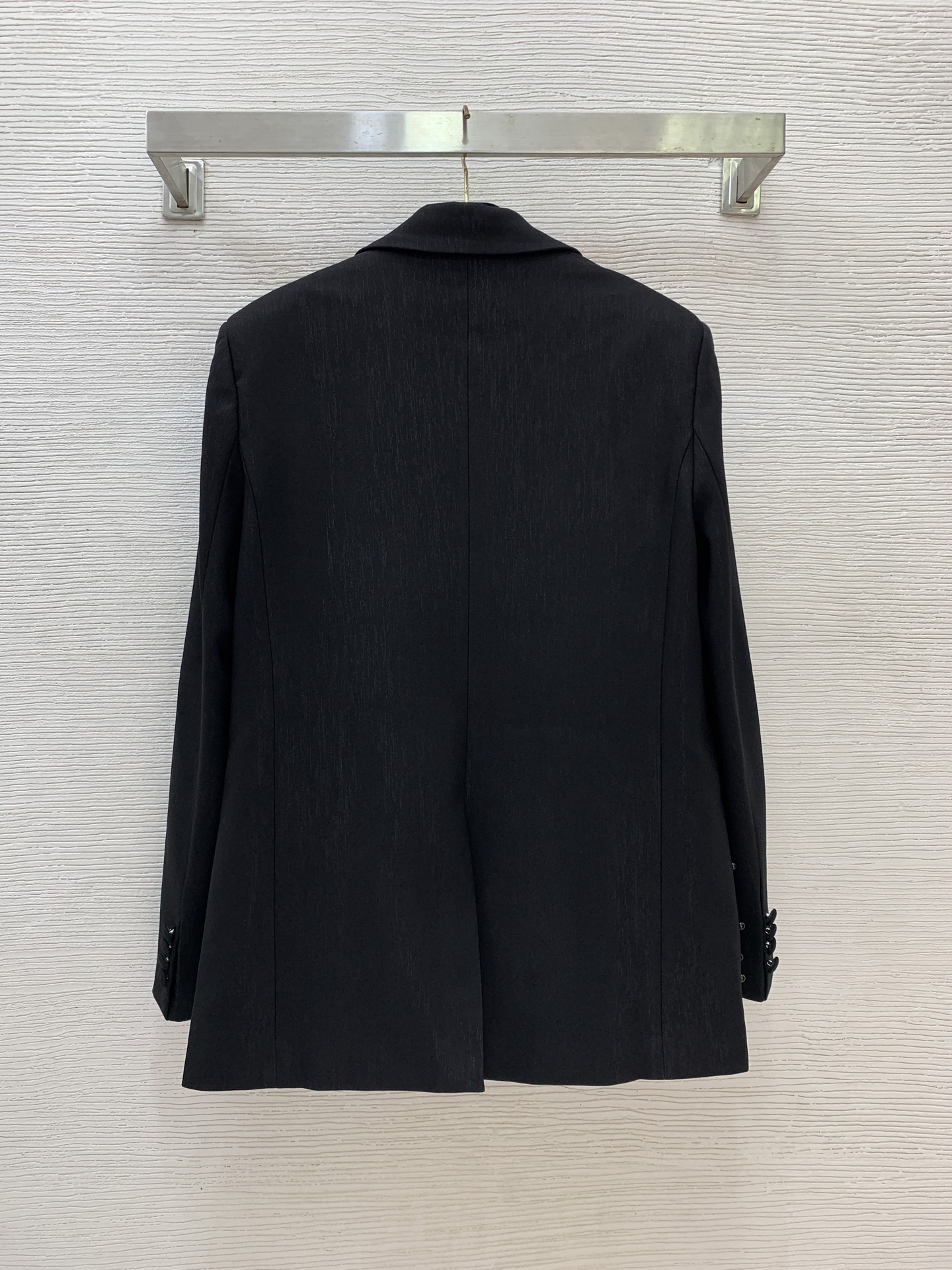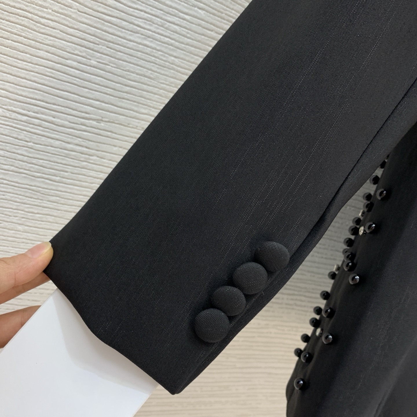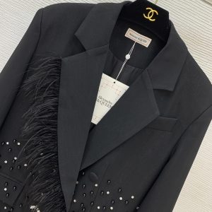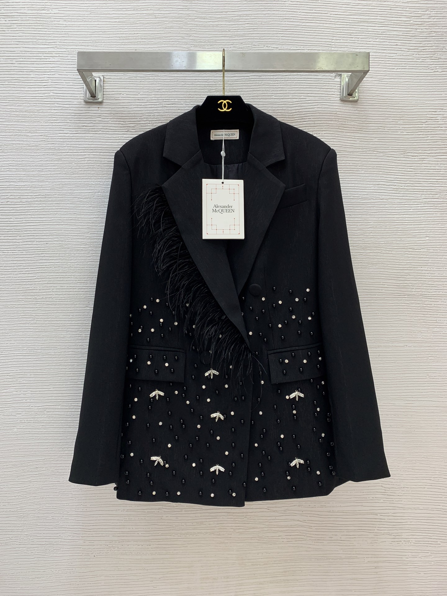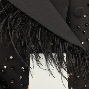 Ostrich feather tassel trim, beaded and rhinestone bee decoration, double-breasted flap pocket with four buttons