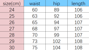 | Clothing size | 24, 25, 26, 27, 28, 29, 30 |